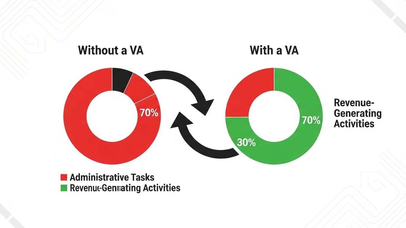 Time Multiplication: Real estate VAs handle administrative burdens, allowing you to focus on high-value activities like client relationships and closing deals. Studies show that realtors spend up to 70% of their time on administrative tasks time that could be better invested in revenue generation.